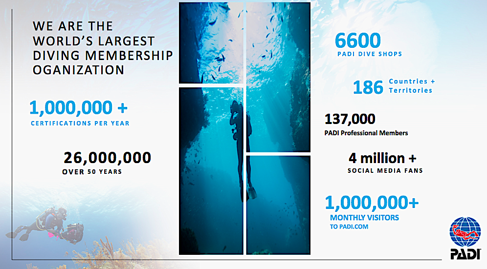 دفاتر PADI با بیش از ۴۰۰ کارمند در خدمت بیش از ۱۳۷ هزارعضو حرفهای و بیش از ۶۶۰۰ مرکزغواصی در۲۰۰ کشور دنیا است