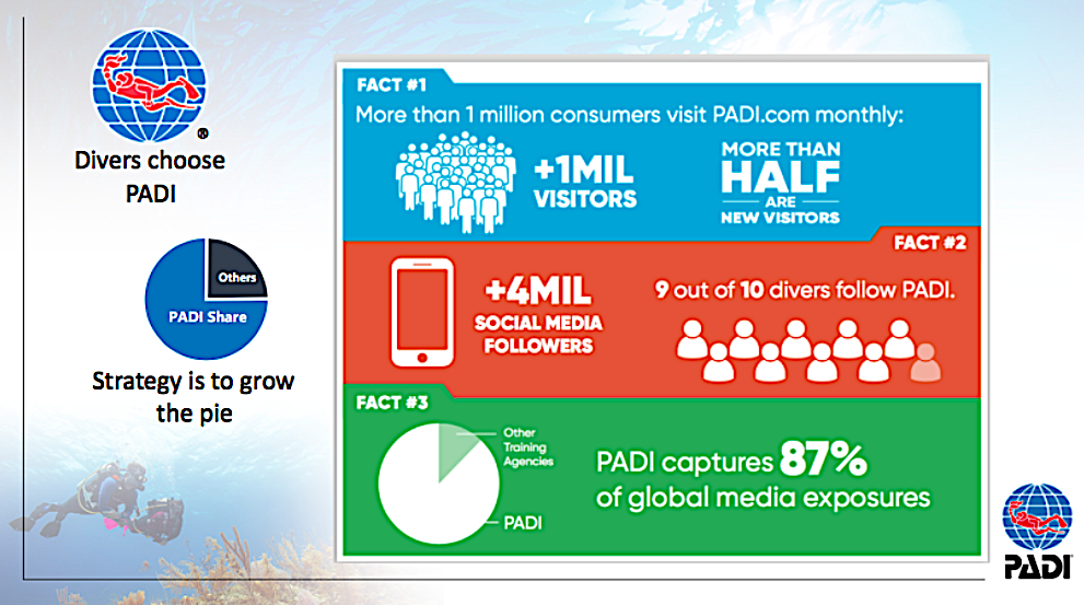وب سایت www.Padi.com ماهانه بیش از یک میلیون بازدید کننده دارد که نیمی از آنها بازدید کننده جدید هستند . همچنین در شبکه های اجتماعیPADI بیش از ۴ میلیون دنبال کننده دارد به عبارتی از هر ۱۰ غواص در شبکه های اجتماعی ۹ نفر PADI را دنبال می کنند . همچنین بخشی از استراژی PADI رشد و گسترش کل صنعت غواصی در جهان است نه فقط رشد PADI و از طریق تمام کانال های خود و اعضای خود این کار ار انجام می دهد و به همین علت ۸۷٪ موارد آگهی های رسانه های جهان توسط PADI جذب می شود . بر همین اساس افراد جدیدی که می خواهند غواصی را شروع و در دوره های آموزش غواصی مبتدی ثبت نام کنند ، حدود ۸۳٪ ازآنها نام و برند تجاری PADI را از قبل شنیده بودند