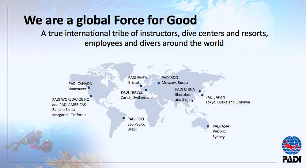 PADI دارای 400 کارمند و دارای دفاتر خدمات به شرح زیر است
